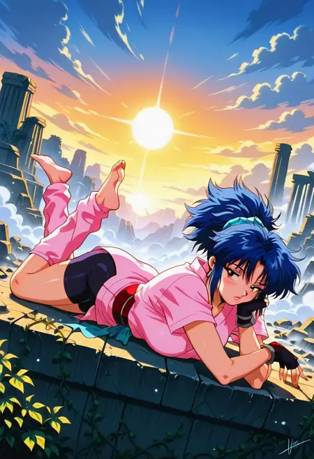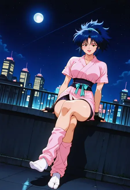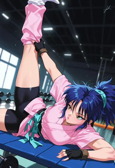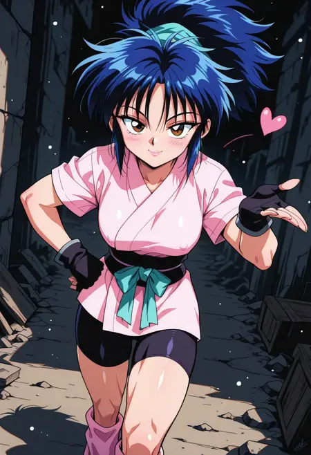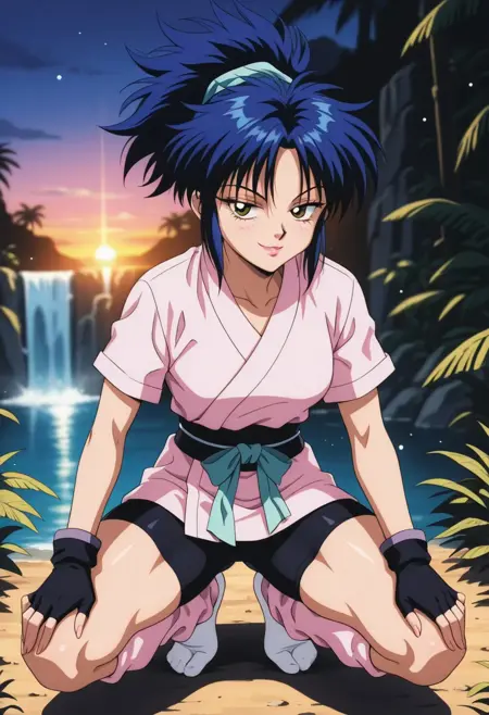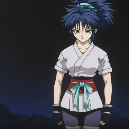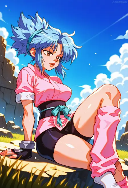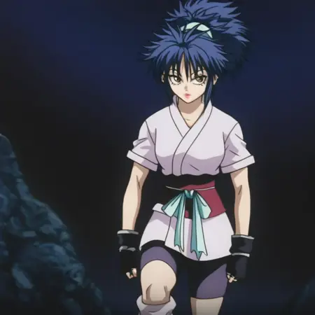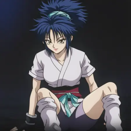 MachiKomacineHxH, 1个女孩, 单人, 凌乱的头发, 蓝色头发, 马尾辫, 刘海, 棕色眼睛, 嘴唇, 日本服饰, 女忍者, 短和服, 粉色和服, 大胸, 绿色腰带, 黑色腰带, 短袖, 黑色手套, 无指手套, 厚大腿, 黑色短裤, 自行车短裤, 粉色腿套, 白色袜子,