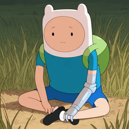 white hat, green backpack, blue shirt, short sleeves, blue shorts, black shoes