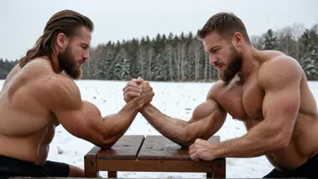 このLoRAは2人の男性が腕相撲をしている様子を生成します。