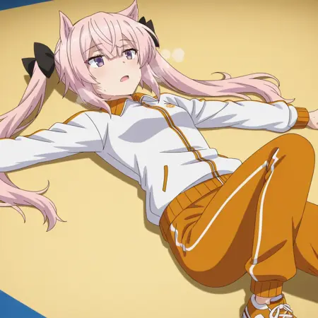 트리거 단어: 카오루 마시코, toji no miko style, 1girl, solo, 분홍 머리, 긴 머리, 십자 앞머리, 눈 사이 머리카락, 고양이 귀, 머리 리본, 검은 리본, 트윈테일, 보라색 눈, 작은 가슴