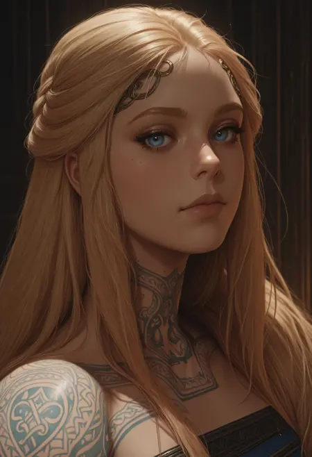 GOWSif, 1girl, blonde hair, blue eyes, long hair, tattoo