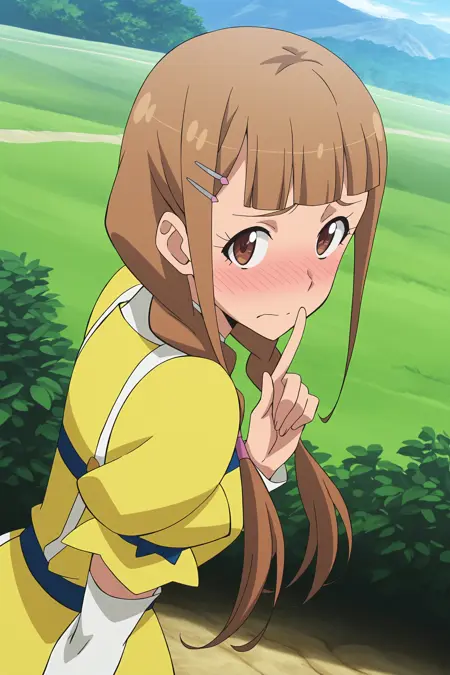 1girl, long hair, bangs, brown hair, brown eyes, hairclip, blunt bangs, twin braids, shandy_gaff_marea