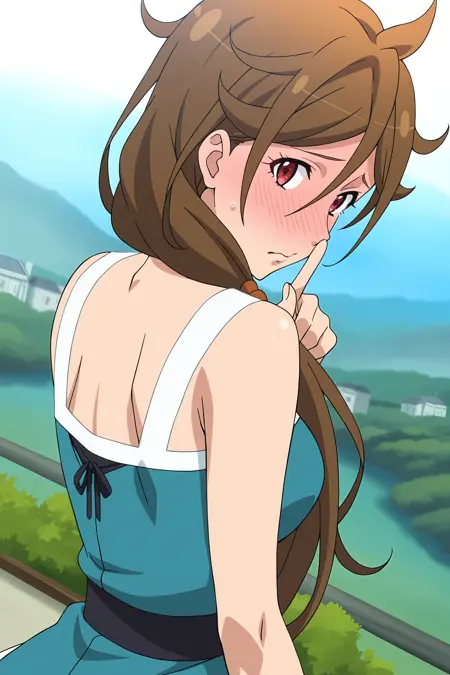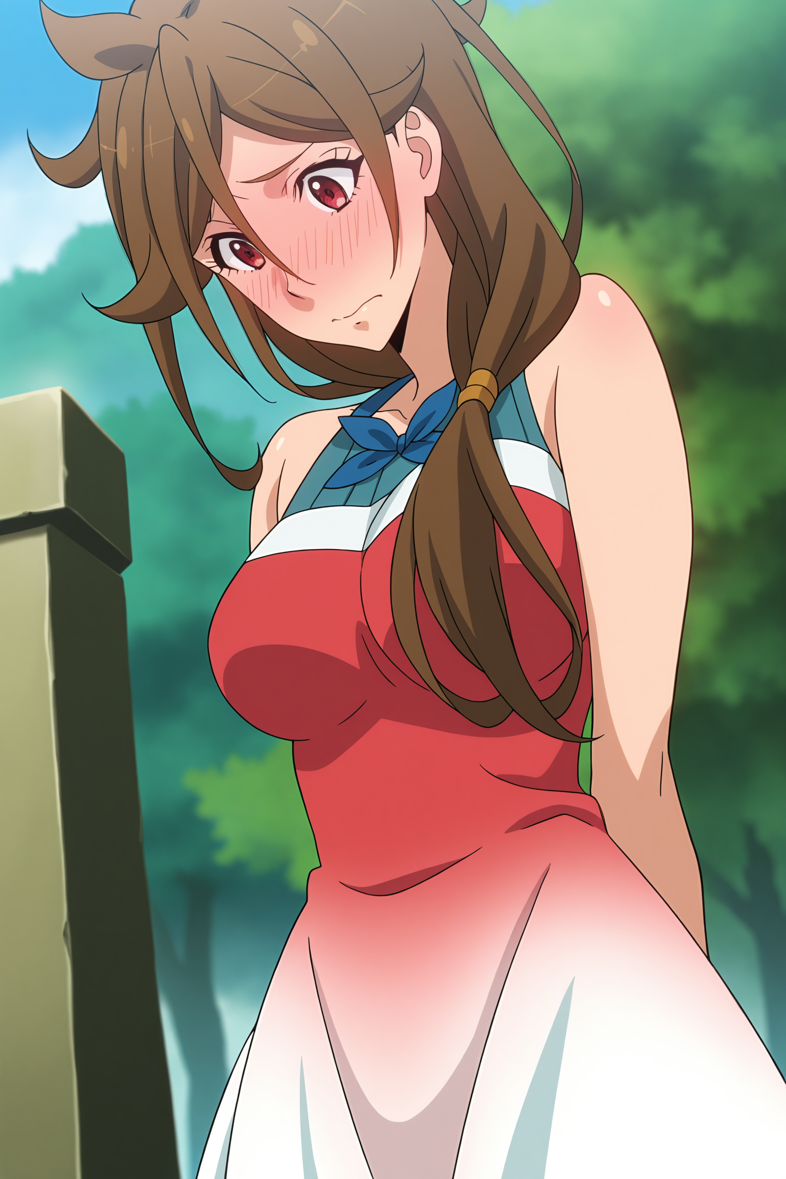 1girl, long hair, brown hair, red eyes, hair between eyes, low ponytail, hair over shoulder, arpeggio el_lelena