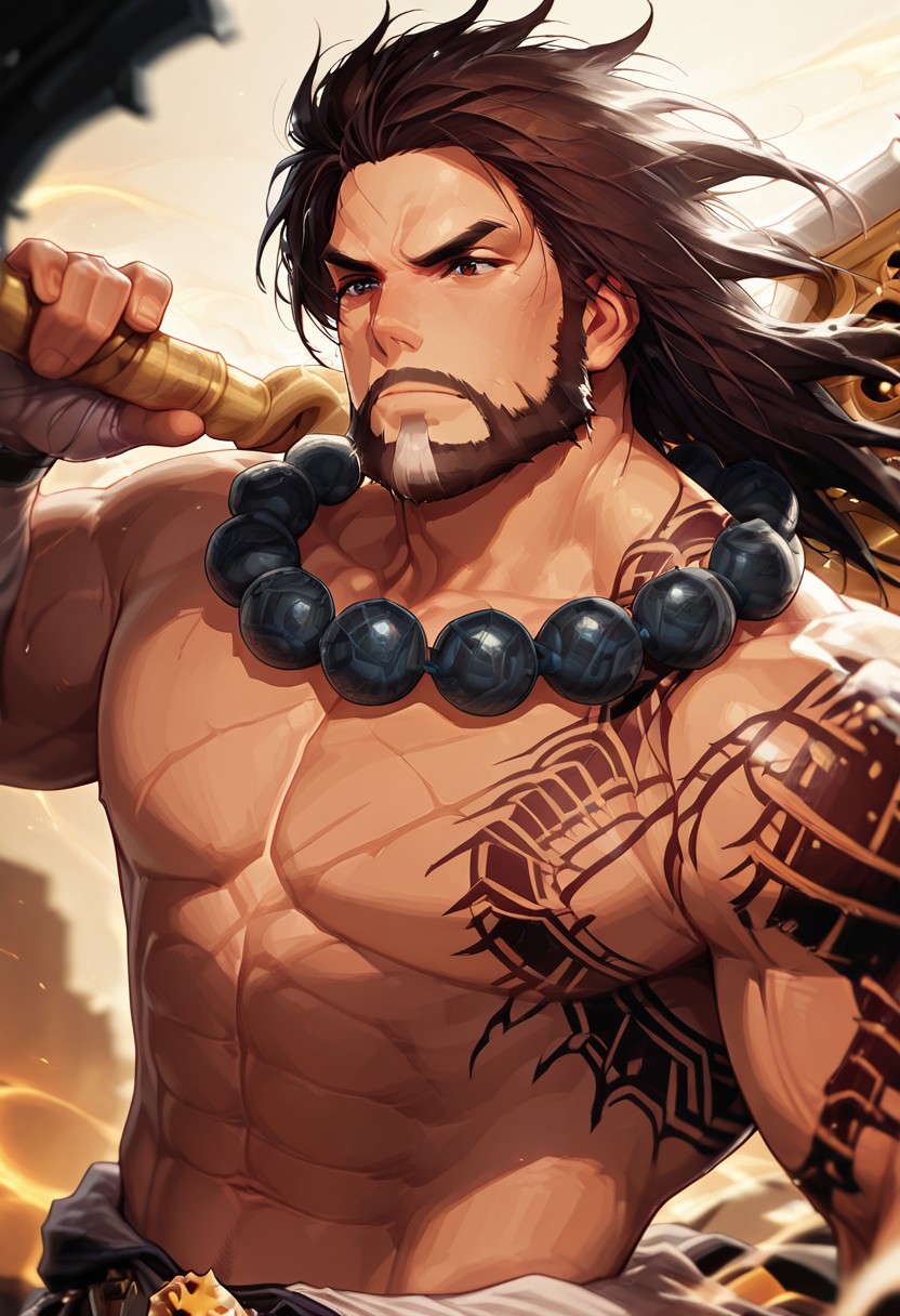prompt:Exorcist, Mature male, muscular, long hair, brown hair, weapon, male focus, tattoo, facial hair, bandages, abs, pectorals, beard, axe,