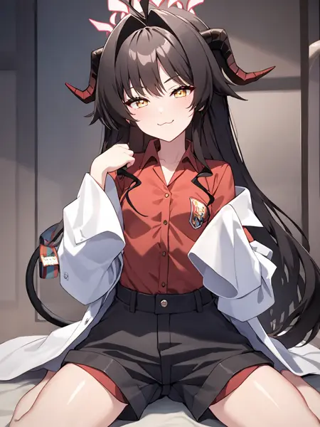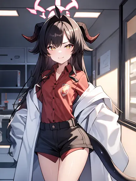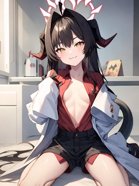 Kasumi (Blue Archive), red shirt, horns, halo, labcoat, black shorts, sleeves past fingers, open coat, tail, off shoulder, sandals