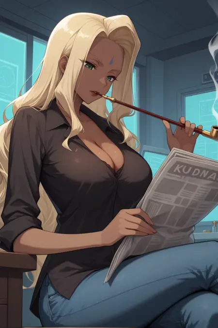 外观:raksh4t4,深色皮肤女性,额头标记,大乳房,绿色眼睛,金色头发,非常长的头发,侧发,红唇