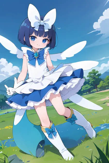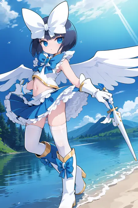 sleeveless, blue bow on chest, miniskirt, white gloves, white thighhighs, boots,