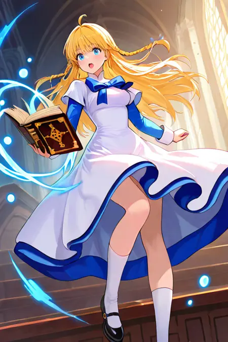 medium breasts, tichieldef, long sleeves, white dress, blue bow, white socks, mary janes, black footwear,
