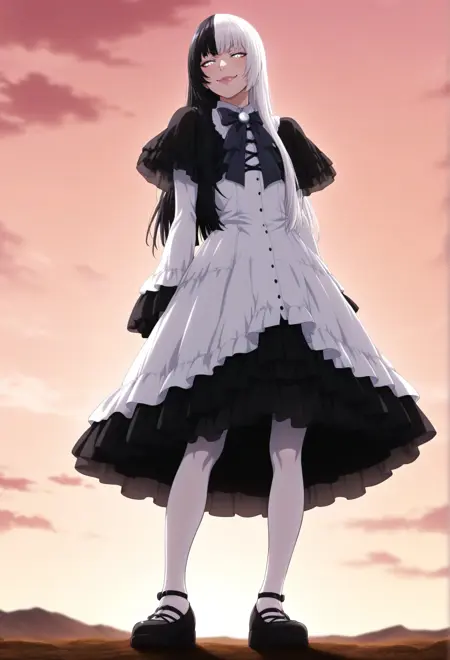 Recommended prompt: 1boy, otoko_no_ko, jiip_stomach, split-color_hair, black hair, white hair, dress, gothic dress, white dress, white eyes