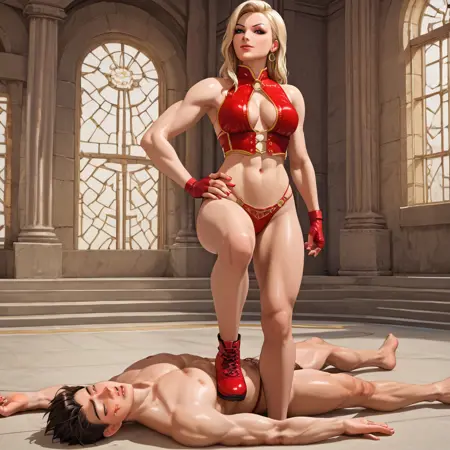 femdom_vi_pose, sadism, 1girl, looking down, smile, stepped on, hand on own hip, humiliation, hetero, femdom, dominant pose, assertive female, trample, 1boy, lying