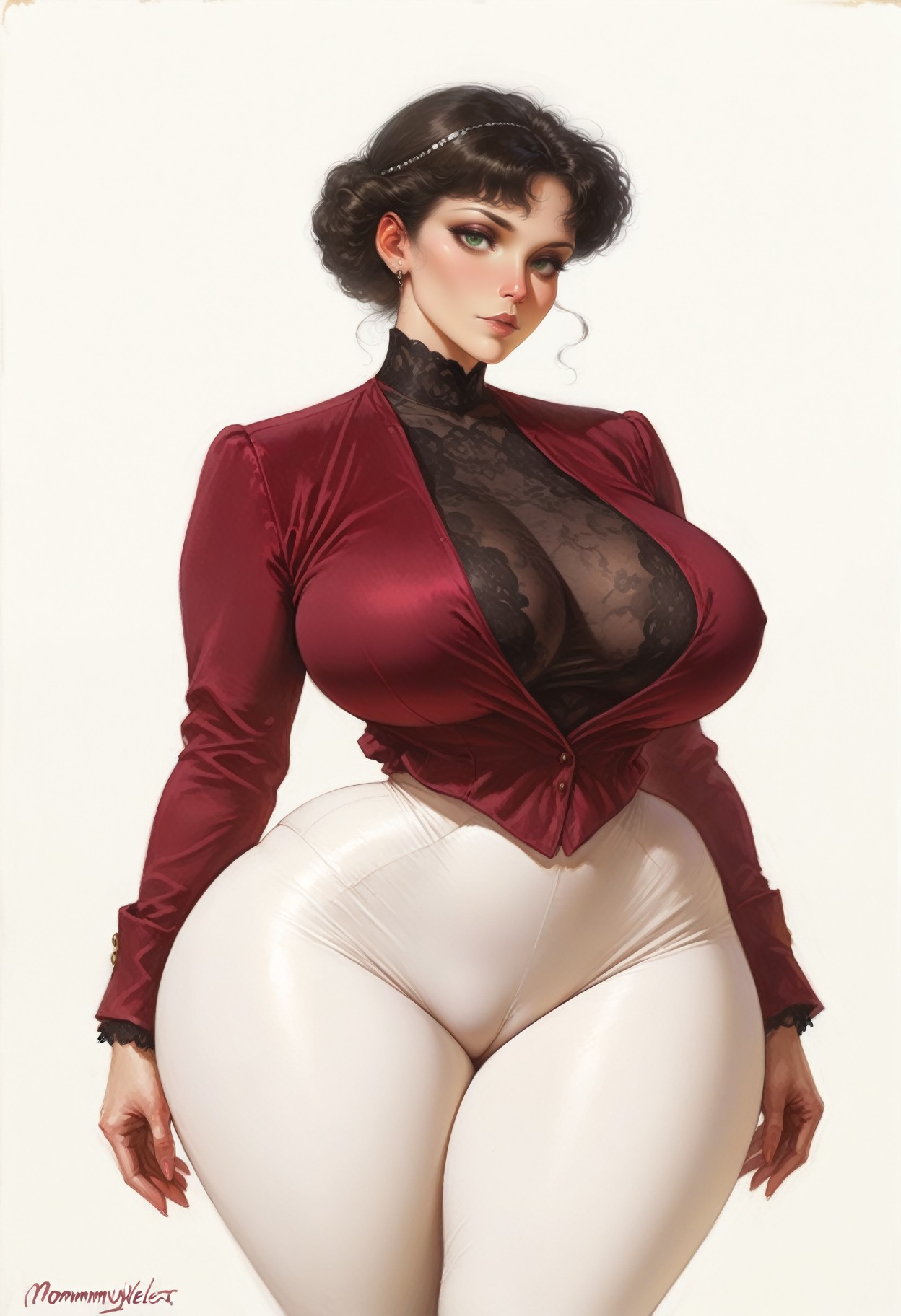 主要触发词是 mommyvelvet,预期的服装通过 红色夹克、黑色蕾丝衬衫、白色裤子 实现。