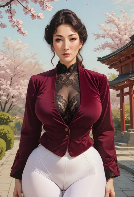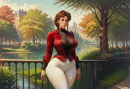 Mature victorian woman blessed with motherly proportions wearing that most scandalous of clothes, pants. At least that's meant to be the default look.