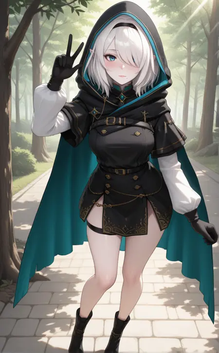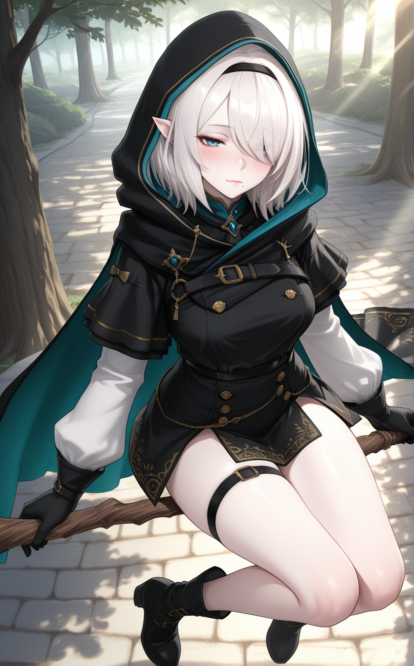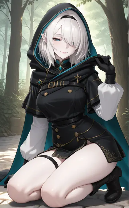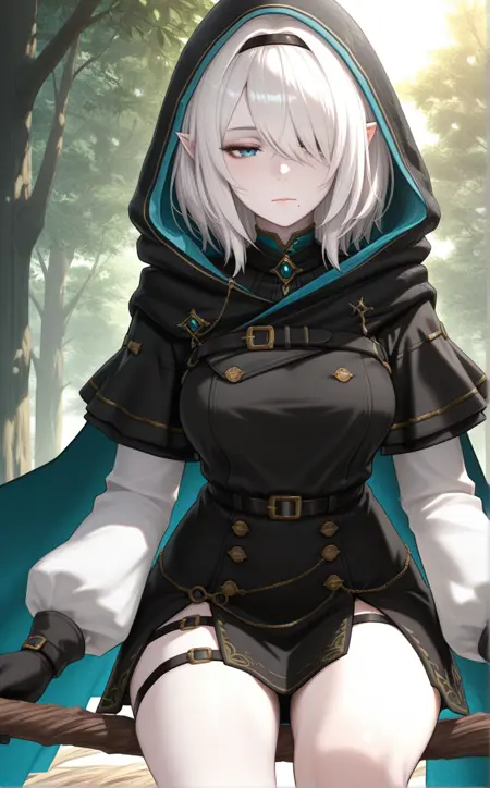 1girl,w1zsher1r1ny,solo, blue eyes, pointy ears,white hair,pale skin,medium breasts,medium hair, hair over one eye, mole under mouth,lips, long sleeves, belt, cloak, black cloak, hooded cloak, medium hair,thigh strap, brooch, black hairband, hooded cape, black gloves, buttons, dress, cape, black cape, jewelry, hood up,indoors,house,room,looking at viewer,expressionless, best quality,masterpiece,sensitive, lora:WizardryShelirionachNoobAI:1