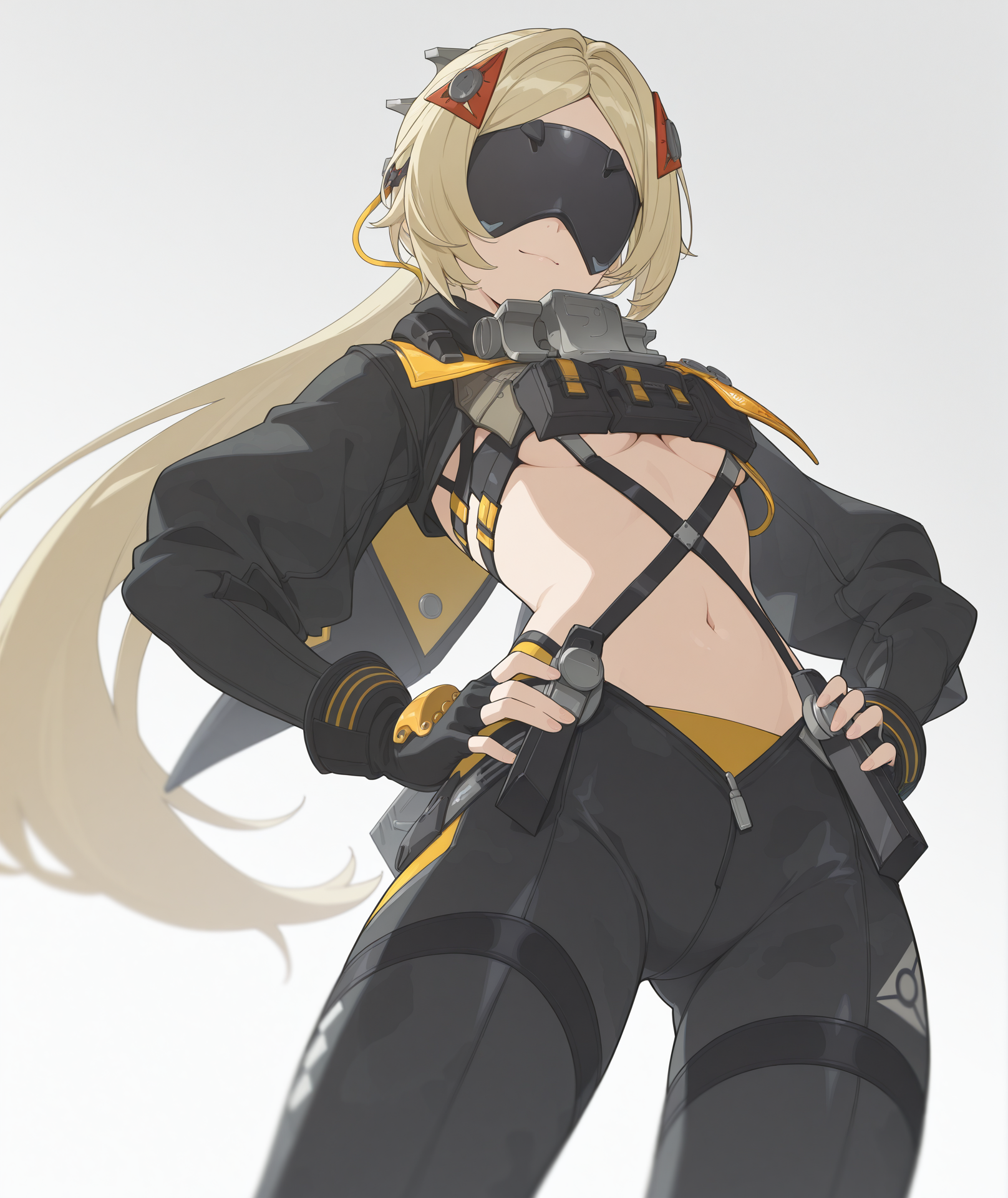 シャツ、長袖、手袋、ジャケット、開いた服、黒い手袋、ふくらはぎの袖、開いたジャケット、黒いジャケット、指なし手袋、クロップドトップ、黒いシャツ、ポーチ、黄色いジャケット