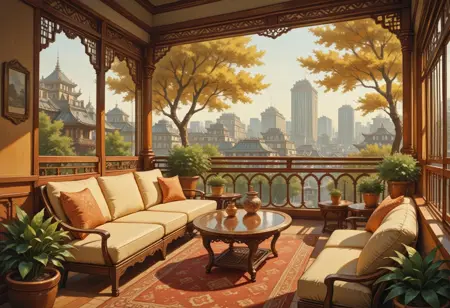 Helpful extras to get the imagination rolling: scenery, rug, table, chair, railing, furniture, balcony, indoors, outdoors, couch, sofa, cushions, potted plants, cityscape, tree,