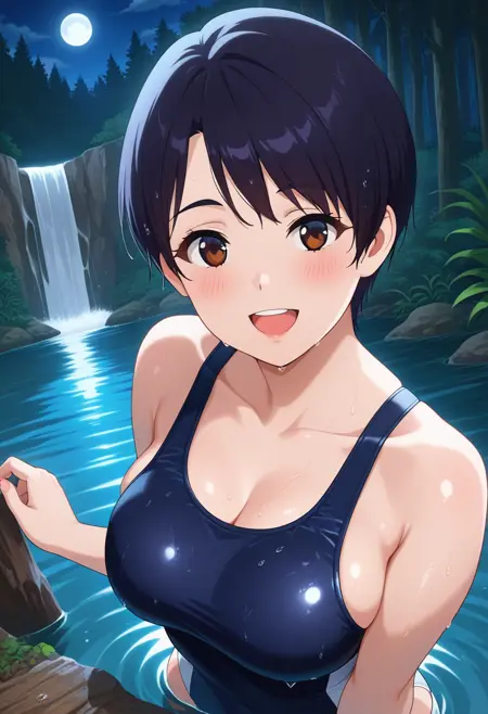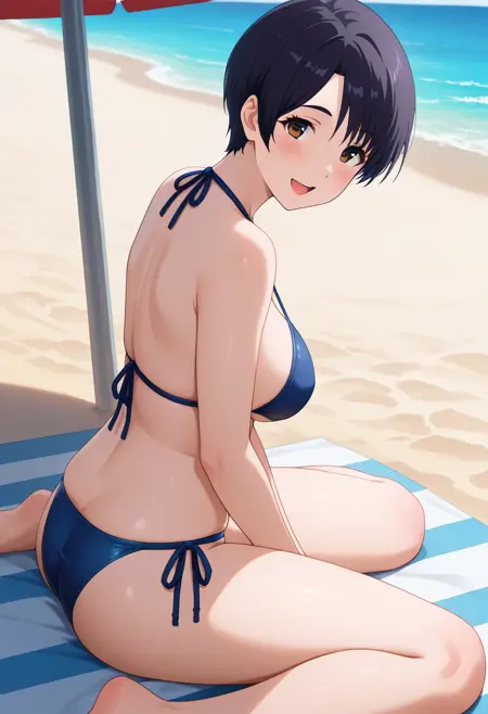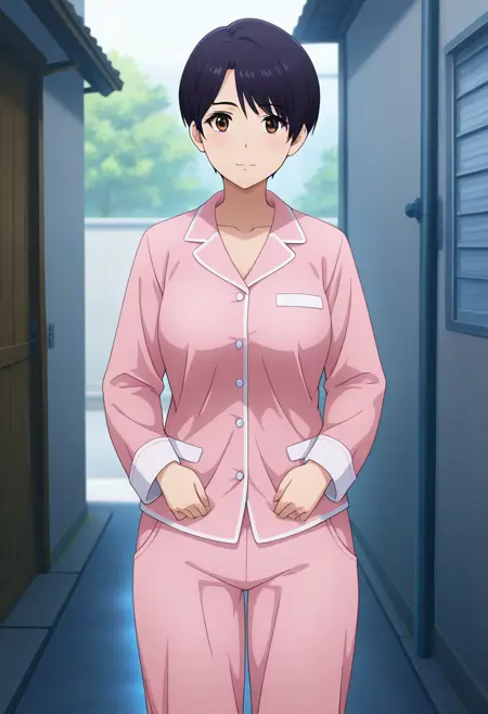 - honokaww, mature female, brown eyes, black hair, short hair, asymmetrical bangs,