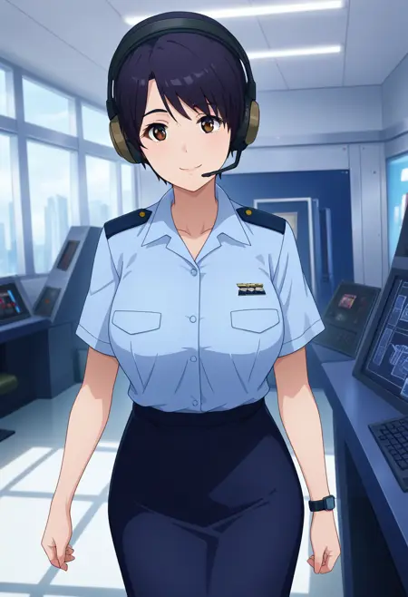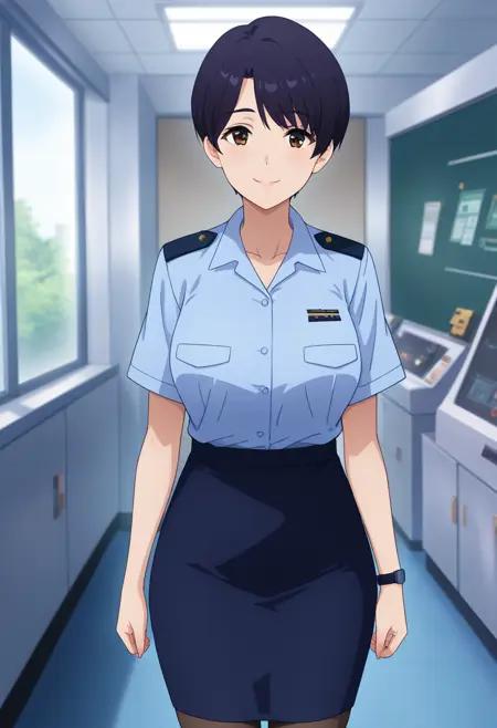- military uniform, blue collared shirt, short sleeves, wristwatch, dark blue pencil skirt, long skirt, pantyhose, pumps, high heels,