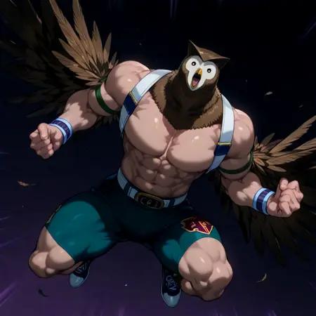 fukuft,健壮,肌肉男性,翅膀,bara,裸上身男性,胸背带,棕色羽毛,猫头鹰男孩,怪物男孩,高大男性,胸背带,动物头部,苍白皮肤,鸟喙,猫头鹰耳朵,腰带,腹肌,绿色短裤,运动鞋,腕带,胸大肌,黑眼睛,喷气背包