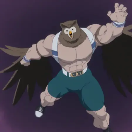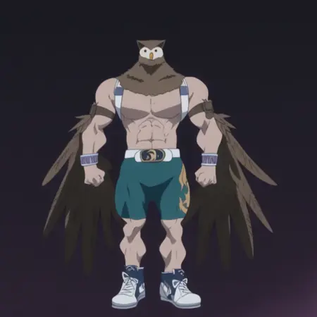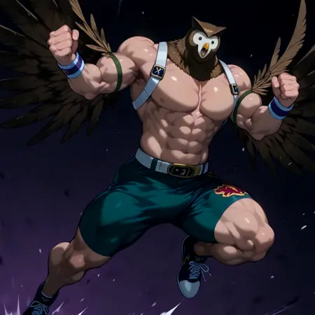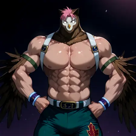 fukuft,健壮,肌肉男性,翅膀,bara,裸上身男性,胸背带,棕色羽毛,猫头鹰男孩,怪物男孩,高大男性,胸背带,动物头部,苍白皮肤,鸟喙,猫头鹰耳朵,腰带,腹肌,绿色短裤,运动鞋,腕带,胸大肌,白眼睛,愤怒,粉发,极短发