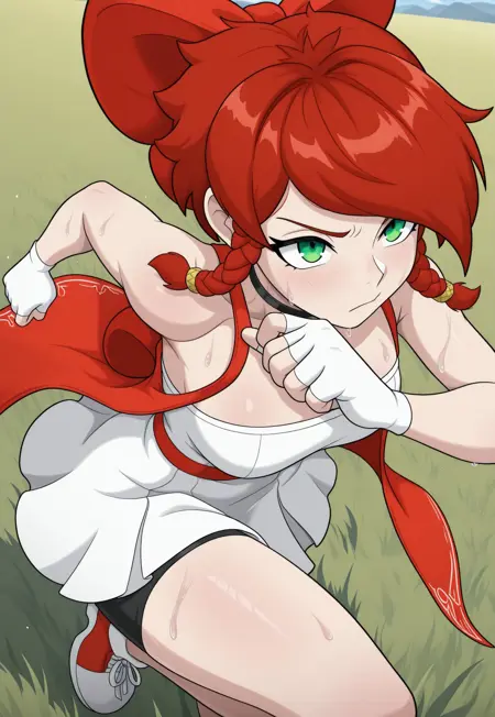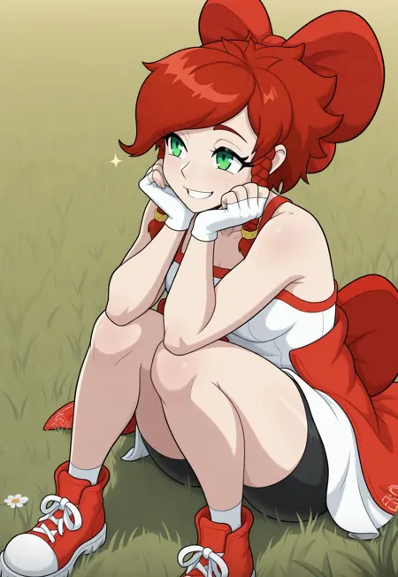 bow, hair bow, red bow, bare shoulders. white gloves, fingerless gloves, white dress, red overcoat, black shorts, red and white shoes,