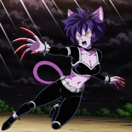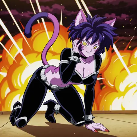 hop \(dragon ball\), short hair, multicolored skin, purple skin, yellow eyes, cat ears, fingernails, cat tail, long fingernails, spiked hair, red nails, two tone tail, colored skin, facial markings, purple hair, markings