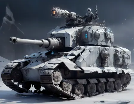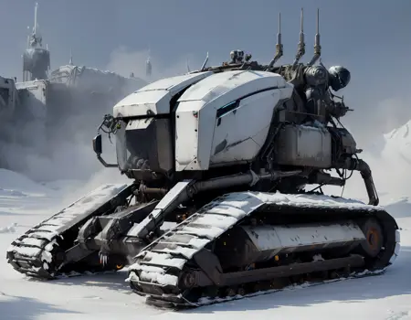 • Snow-crawler vehicle on scouting mission, treads leaving deep trails