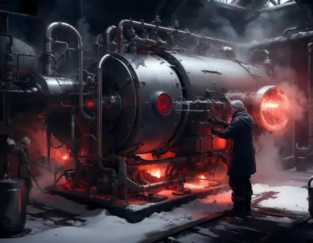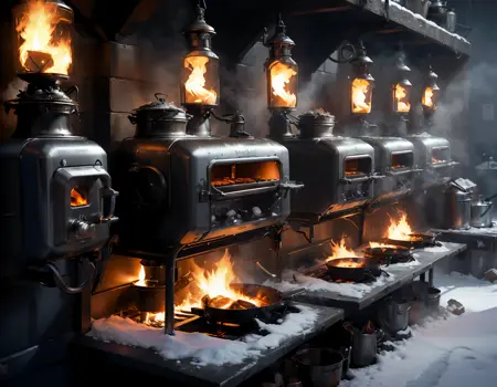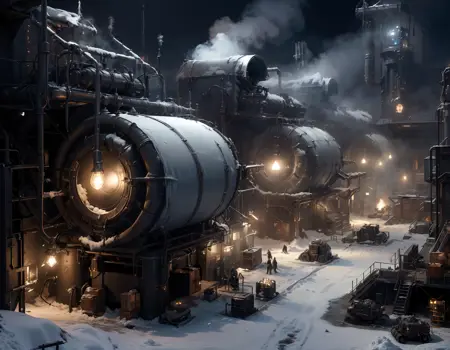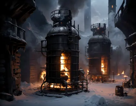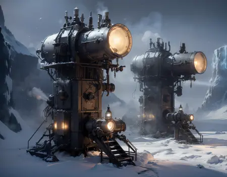 "(frostpunkai:1.4) *** , freeze, steel (amazing, Impressive lighting, muted colors, Ultra Realistic, trending on artstation, exaggerated, detailed background:1.1)"