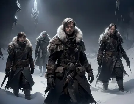 - Hunter teams setting out into white void, bundled in furs and armed with harpoons