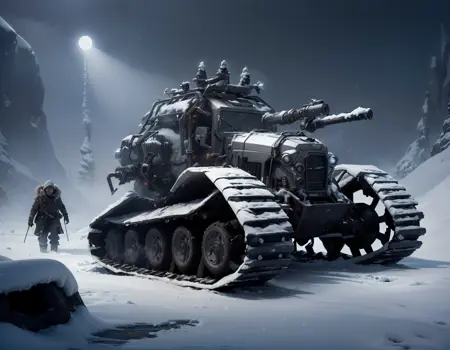 - Snow-crawler vehicle on scouting mission, treads leaving deep trails