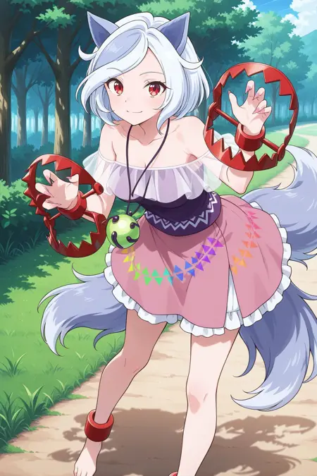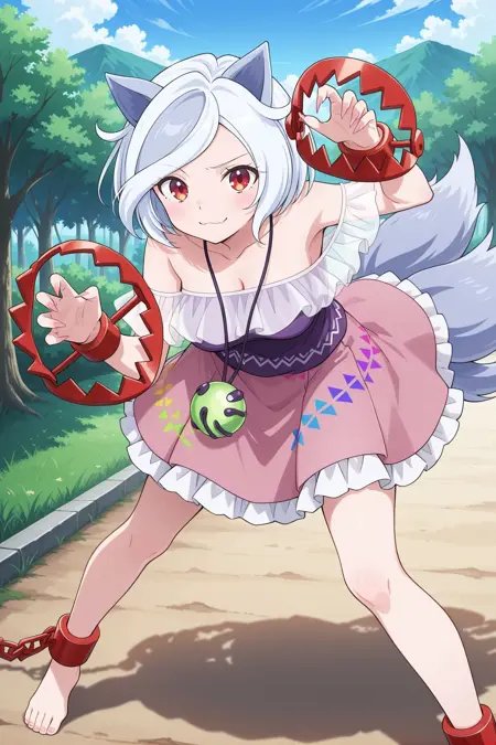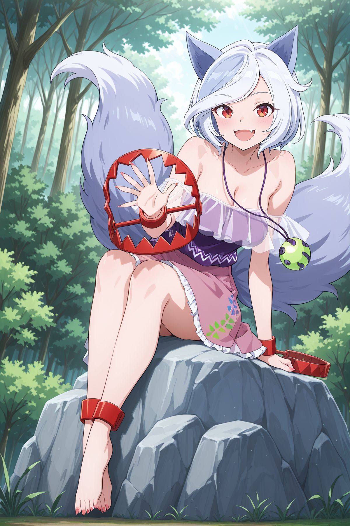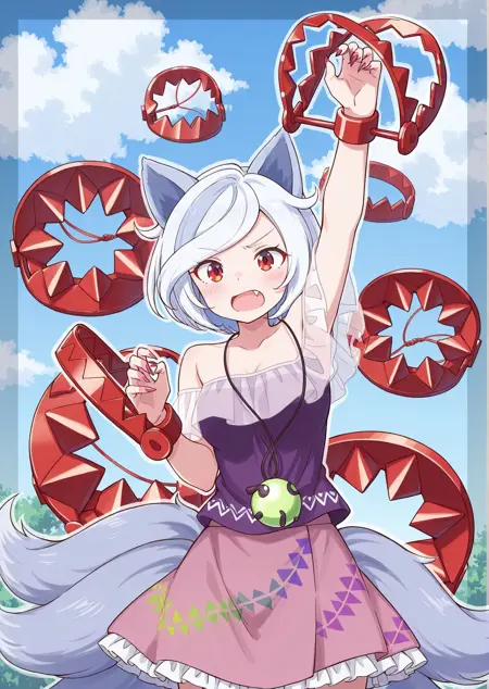 mitsugashira enoko, 1girl, solo, red eyes, white hair, short hair, dog ears, multiple tails, long fingernails, medium breasts,