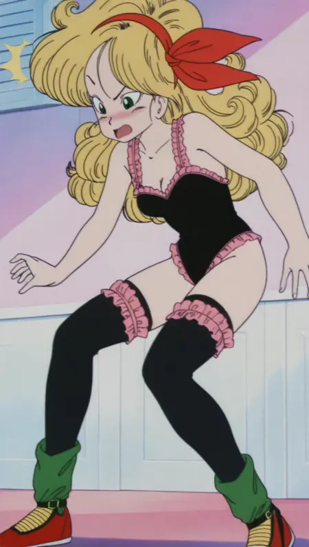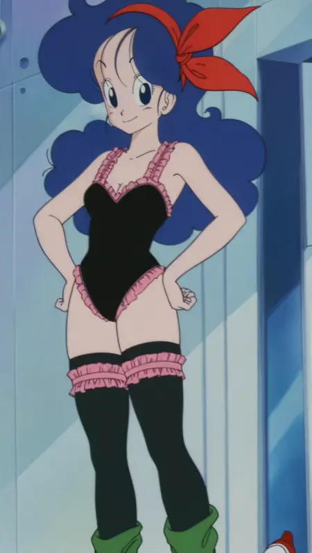 下着装束、レオタード、フリル付きレオタード、フリル、大腿長ズボン、フリル付き大腿長ズボン、黒の大腿長ズボン、下着、赤い靴、緑の靴下、靴、