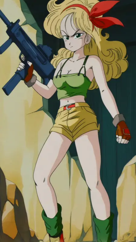 criminal outfit, crop top, tank top, navel, midriff, breasts, cleavage, yellow shorts, gloves, fingerless gloves, red shoes, green socks, shoes,