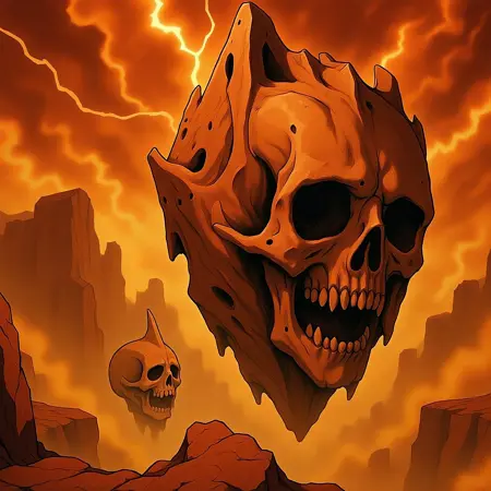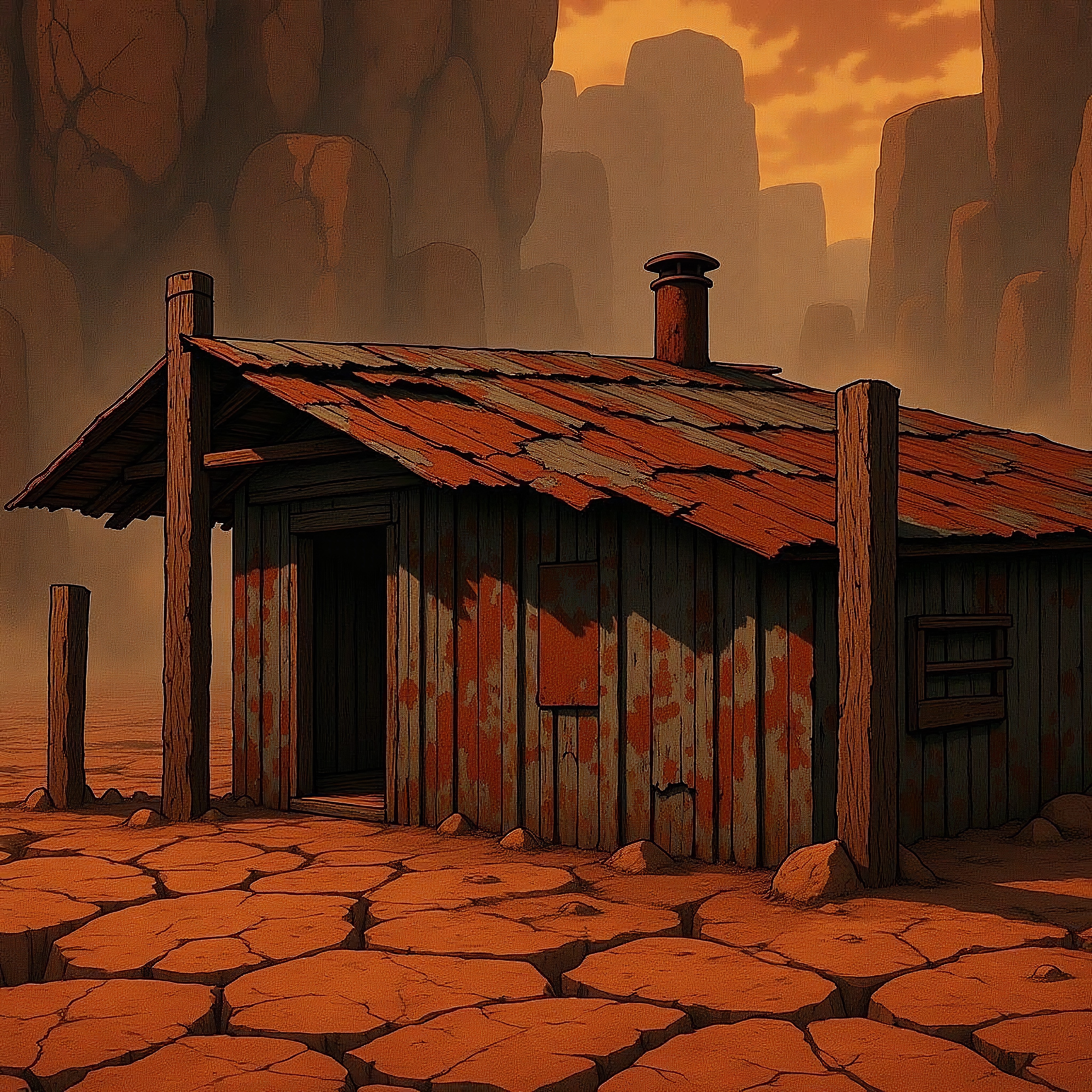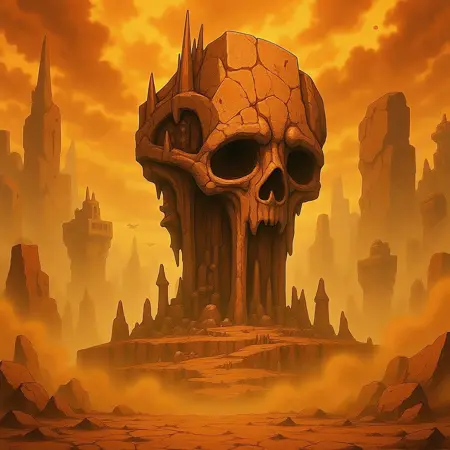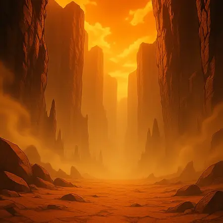 anime style, cel-shaded textures, stylized lighting, glowing orange sky, dense orange clouds, warm dusty atmosphere, surreal anime landscape, cursed dimension, floating stone formations, rust-colored rocks, cracked ground, stylized fog, eerie orange mist, jagged cliffs, desolate wasteland, abandoned environment, cinematic anime composition, detailed illustration, haunting scenery, glowing mist, broken stone terrain, low-angle shot, first-person anime view, ghostly atmosphere, soft shadows, glowing highlights, vibrant anime tones, deep haze, post-apocalyptic desert, surreal canyon