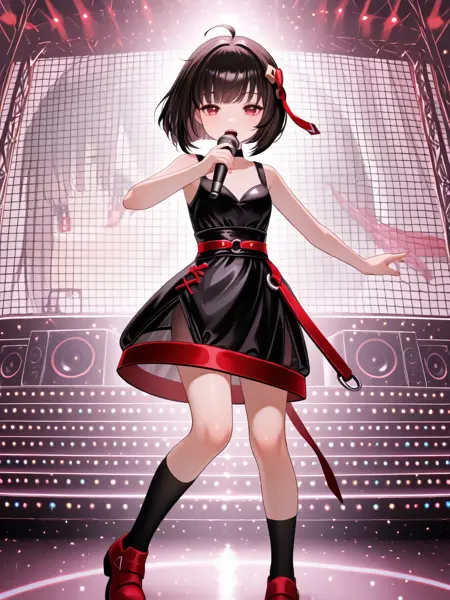 ahoge, short hair, bob cut, bangs, black hair, brown hair, red eyes,