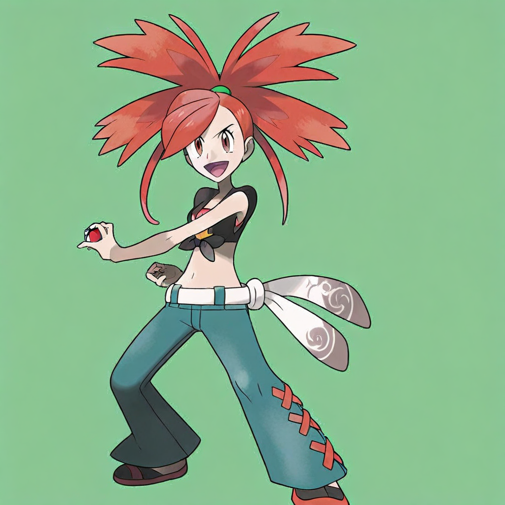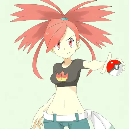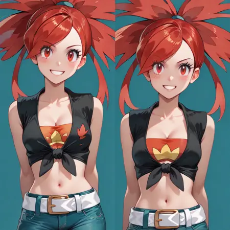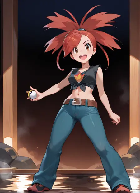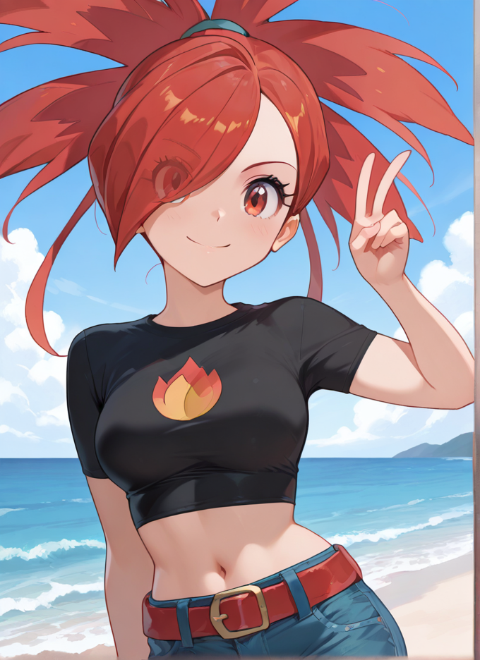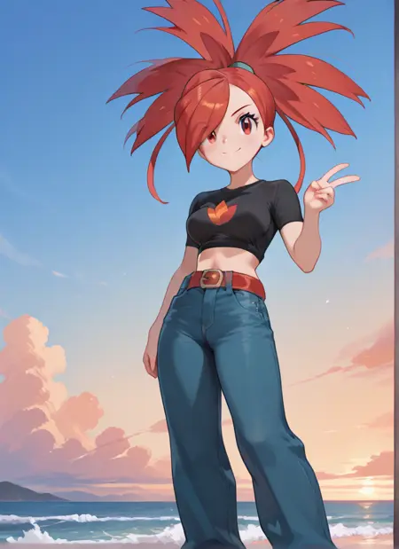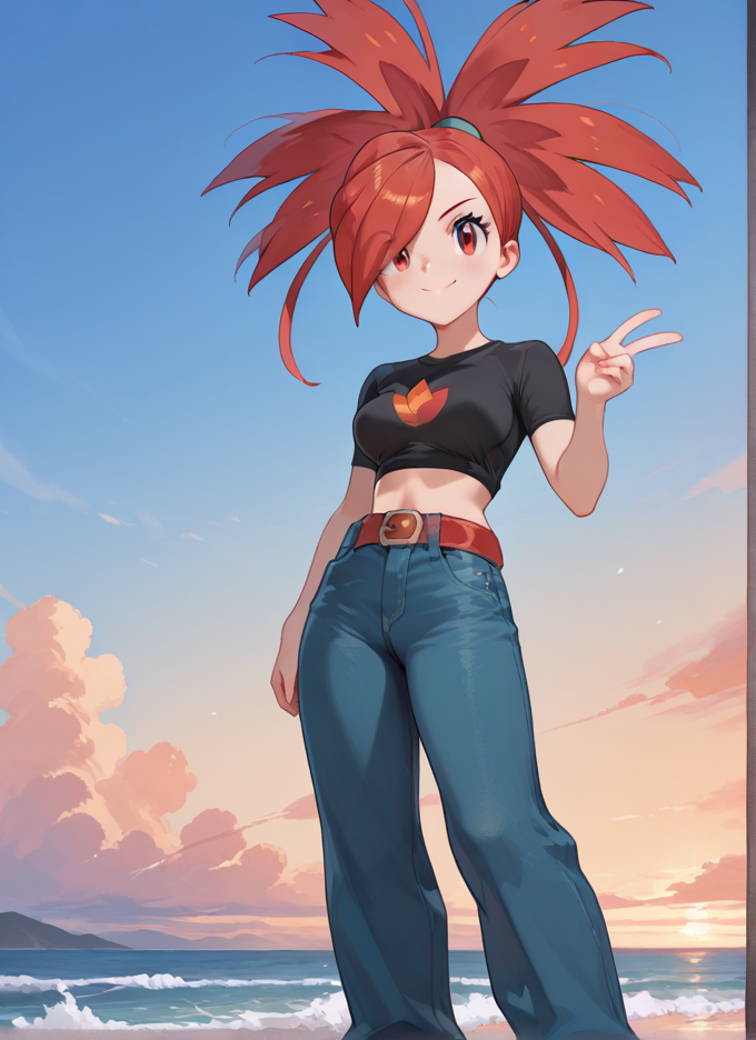 long hair, shirt, red eyes, navel, ponytail, short sleeves, red hair, shoes, pants, belt, midriff, black footwear, hair over one eye, crop top, black shirt, eyelashes, denim, t-shirt, buckle, jeans, belt buckle, blue pants, hair tie, cropped shirt, red belt