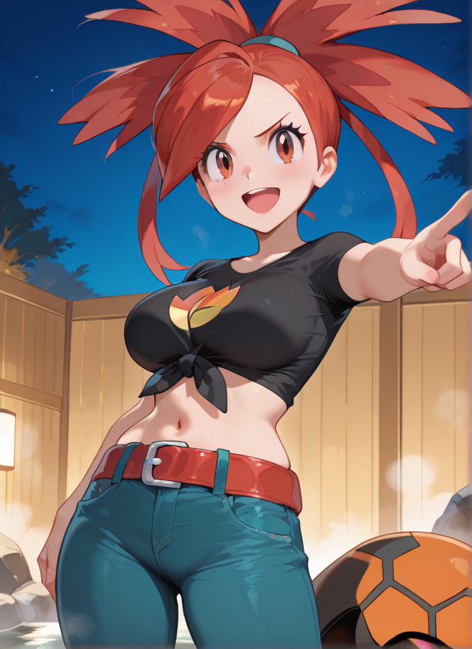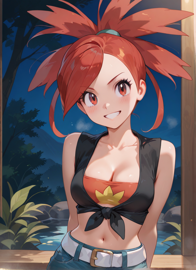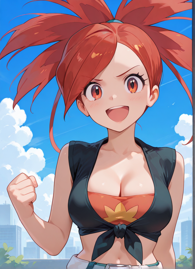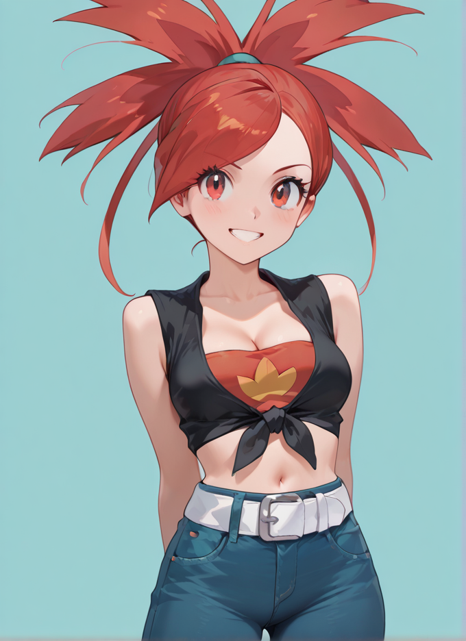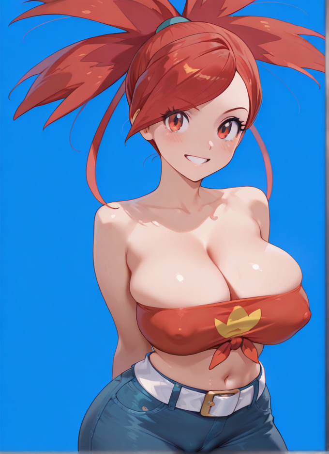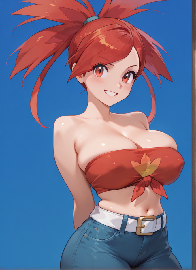 long hair, shirt, red eyes, navel, bare shoulders, collarbone, ponytail, red hair, sleeveless, pants, belt, midriff, crop top, black shirt, eyelashes, strapless, sleeveless shirt, bare arms, swept bangs, denim, front-tie top, buckle, jeans, belt buckle, blue pants, hair tie, bandeau, tube top, tied shirt, white belt, red bandeau