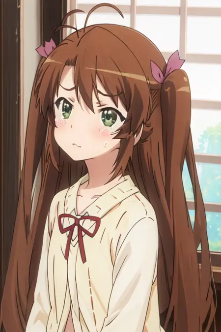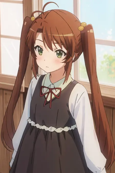 触发词为 koshigaya_komari_nonnonbiyori,推荐标签为:best quality, masterpiece, highres, solo, {koshigaya_komari_nonnonbiyori:1.15}, brown_hair, long_hair, green_eyes, blush, antenna_hair, bangs