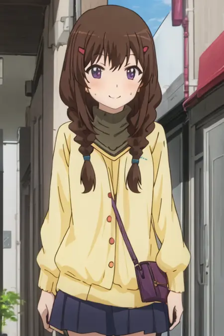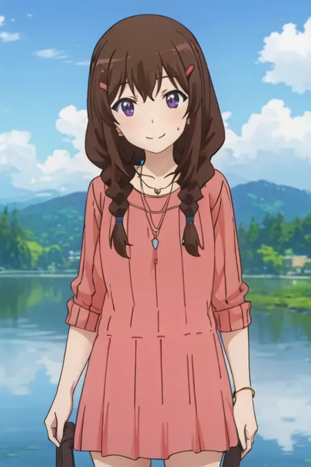 触发词为 fujimiya_konomi_nonnonbiyori,推荐标签为:best quality, masterpiece, highres, solo, {fujimiya_konomi_nonnonbiyori:1.15}, brown_hair, hair_ornament, hairclip, long_hair, purple_eyes, braid, smile, blush