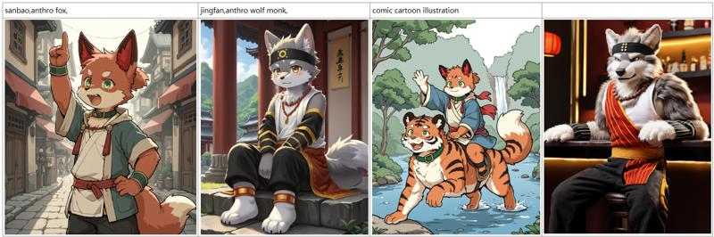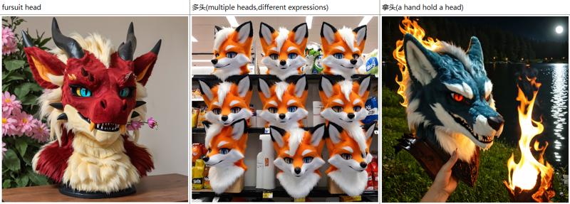 这是一个泛化性很强的兽装LoRA,训练了三种常见的兽装风格(kemono fursuit、realistic fursuit、toony fursuit),可绘制后视图或仅头部。为提升泛化性并改善原始模型效果,还进行了许多其他方面的训练。下载时较小的文件为prompt示例。