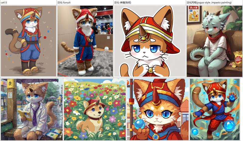 顺便训练了一些角色“猫十三”(cat13)、ori、三宝(sanbao)、净饭(jingfan),但使用的图像较少,目的是尽量避免概念干扰意外影响模型泛化能力,因此未采用角色专用的训练方法。故此模型并非专为角色训练设计,特征学习不足,效果不佳。