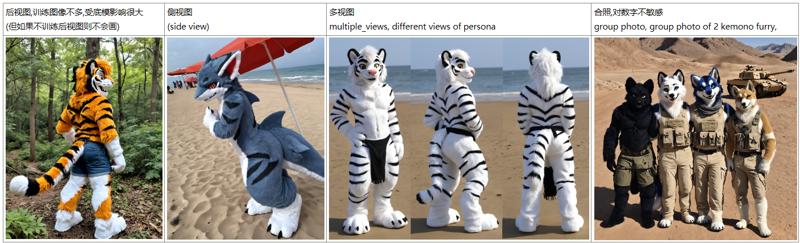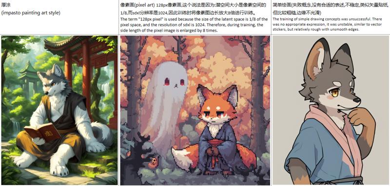 为改善原始模型效果,模型还训练了动漫风格、厚涂风格、128px像素风格、简约绘画风格、虚拟与现实结合等多种风格,并尝试提升柴犬的显示效果。总共使用了约540张图像,其中约260张用于兽装训练,其余用于改善模型表现。但在具体概念上可分配的图像数量有限,因此部分概念仅用几张图训练,可能需要多次尝试。
