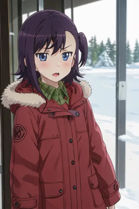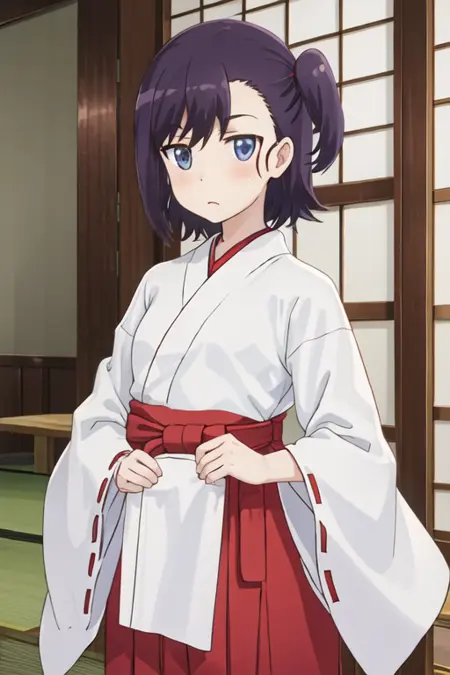 触发词为 miyauchi_hikage_nonnonbiyori,推荐标签为:best quality, masterpiece, highres, solo, {miyauchi_hikage_nonnonbiyori:1.15}, blue_eyes, purple_hair, blush, one_side_up, black_hair, short_hair
