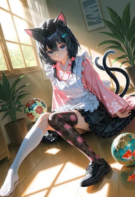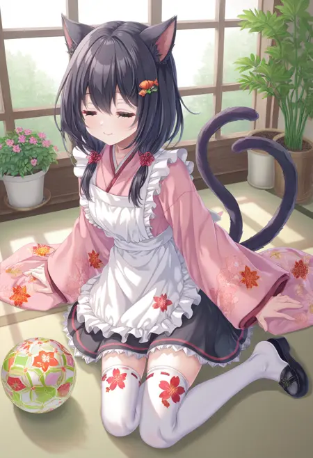 hair style: medium hair, hair between eyes, low twintails, hair over shoulders, pink flower hair ties,