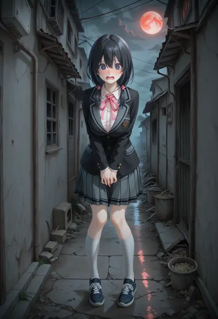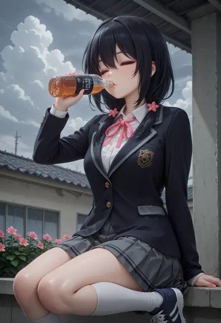 outfit: black blazer, long sleeves, sleeves past wrists, button \(fastener\), grey pockets, pink neck ribbon, white wing collar shirt, grey pleated skirt, white knee high socks, dark blue sneakers, white shoe laces,