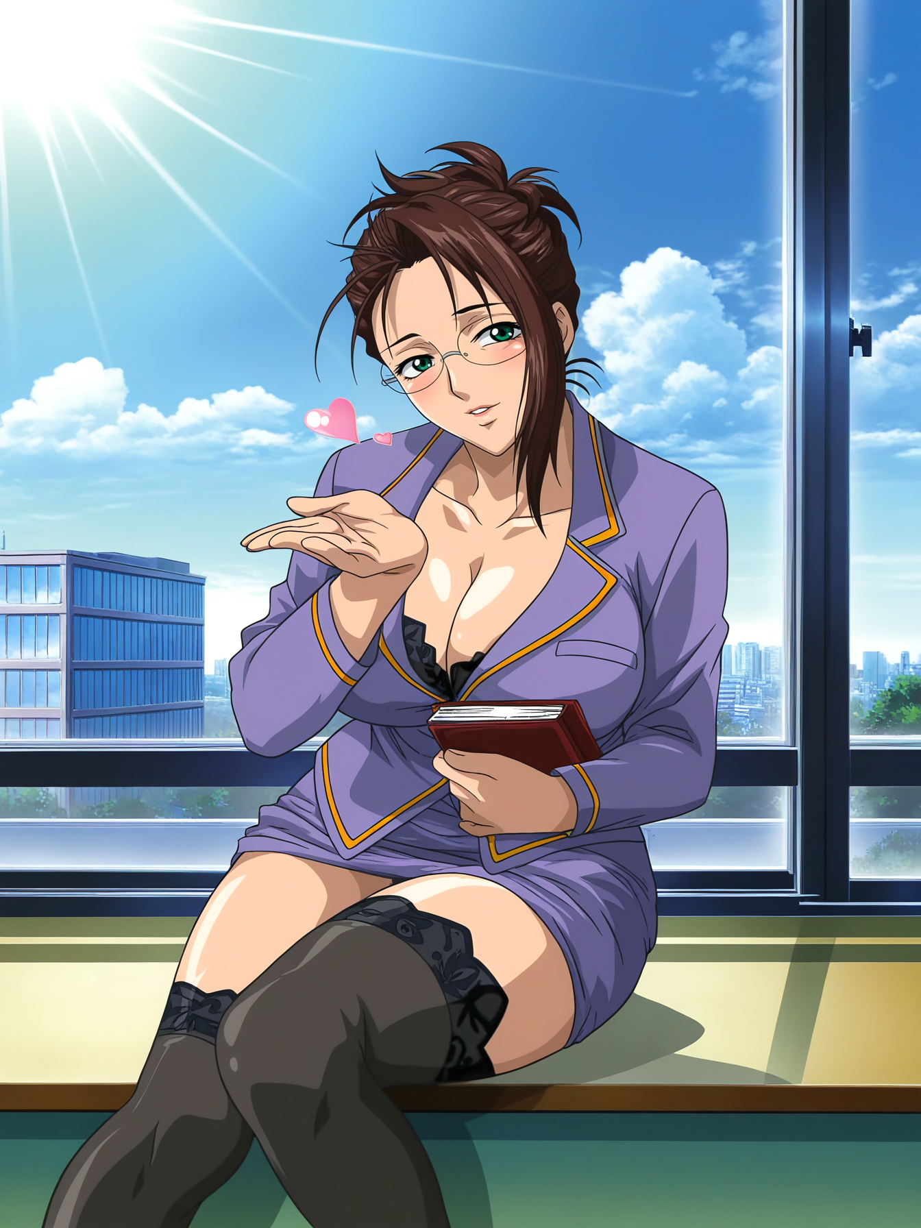 블레이저, 연필 스커트, 검정 허벅지 긴 양말, 레이스 장식, 하이힐, 검정 신발, 검정 브라