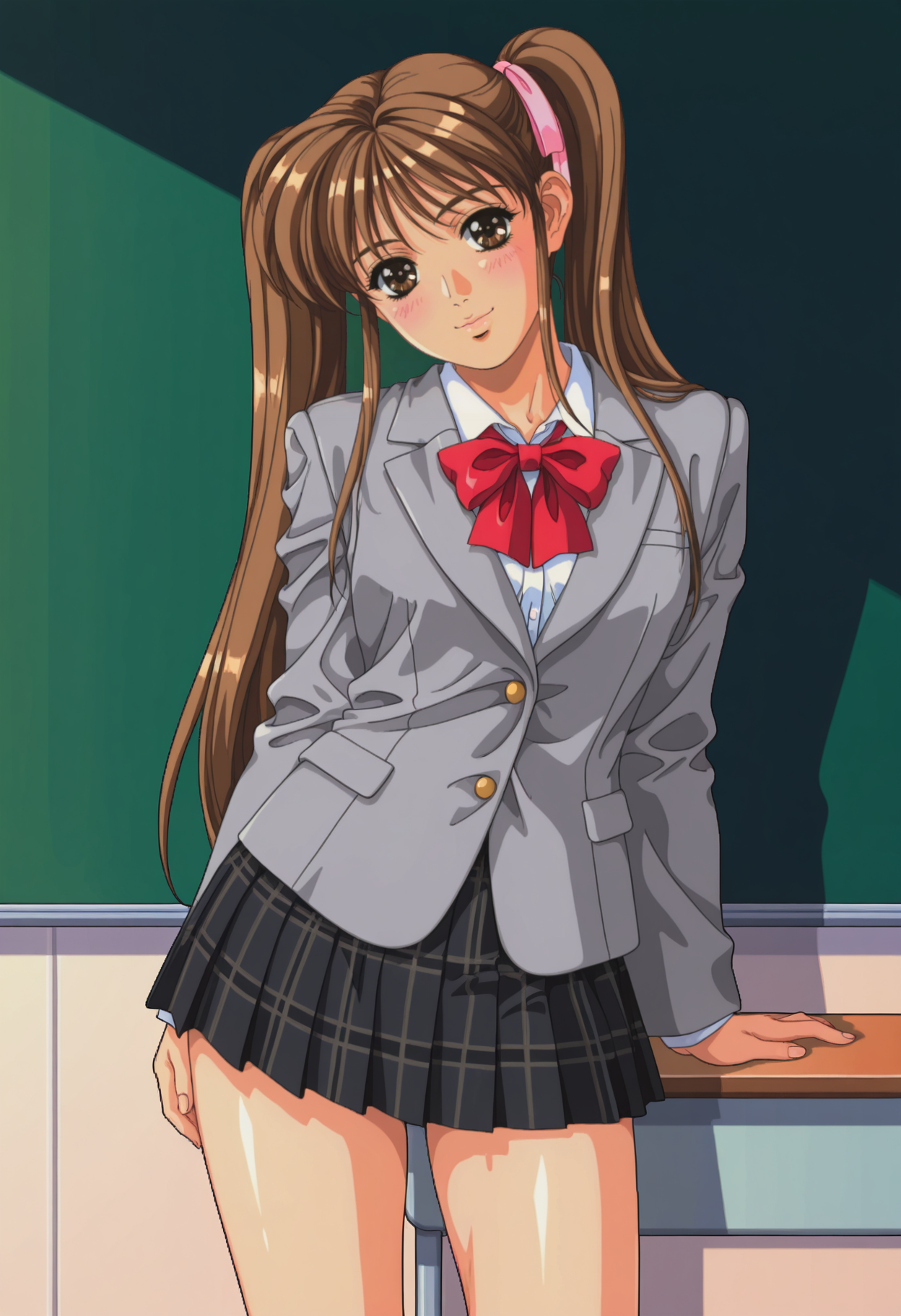 픽셀 아트, 1990년대 \(스타일\), 갈색 머리, 긴 머리, 듀얼 테일, 갈색 눈, 분홍 리본, 머리 리본,