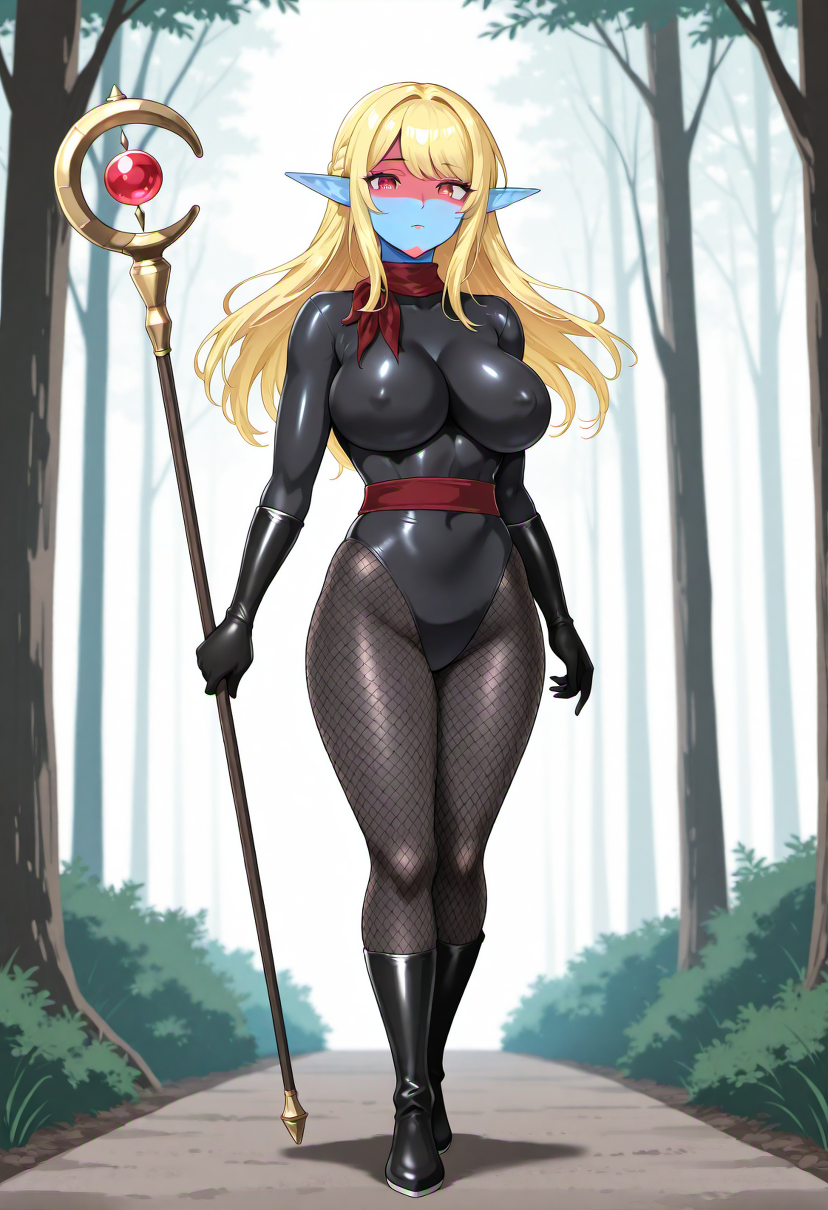 shocker, colored skin, black leotard, latex elbow gloves, brown fishnet pantyhose