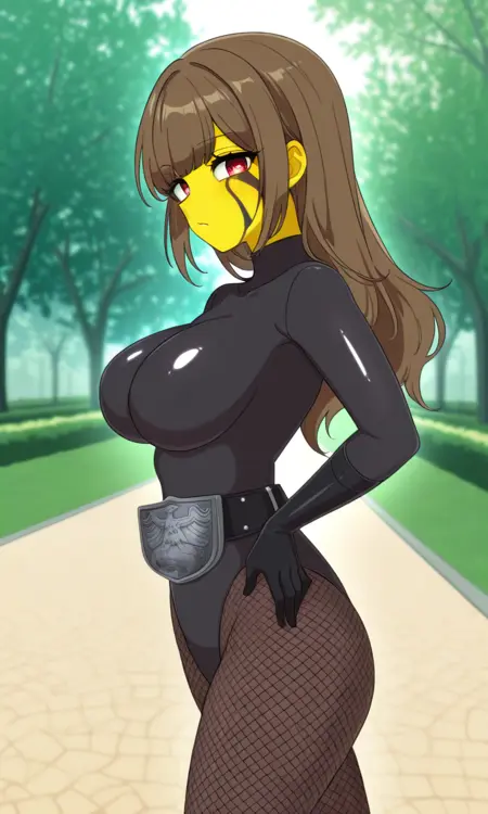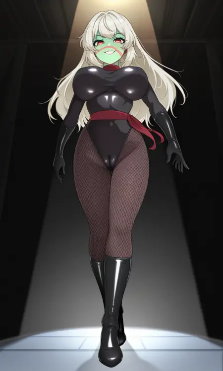 shocker, colored skin, black leotard, latex elbow gloves, brown fishnet pantyhose
