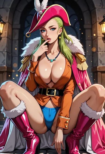OliveOP,1个女孩,单独,高个子女性,沙漏体型,绿色头发,长发,蓝色眼睛,丰满的嘴唇,粉色双角帽配大粉色羽毛,黄色耳环,珠串项链,白色毛皮镶边,大胸部,未扣扣子的橙色衬衫,乳沟,大腰带,蓝色牛仔比基尼底裤,粉色船长夹克,白色褶边,粗大腿,粉色褶边靴子,珠宝,肩章,