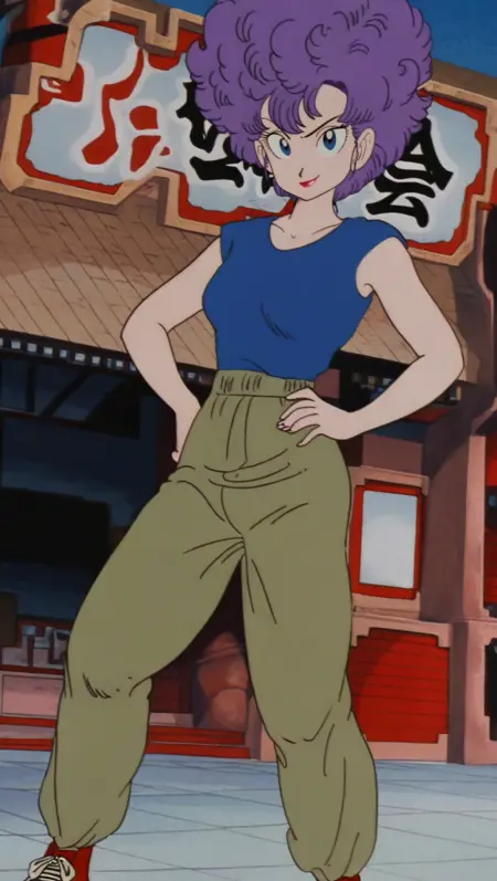 21st WT、青いシャツ、ノースリーブ、緑のズボン、スニーカー、赤い靴、メイク、リップスティック、